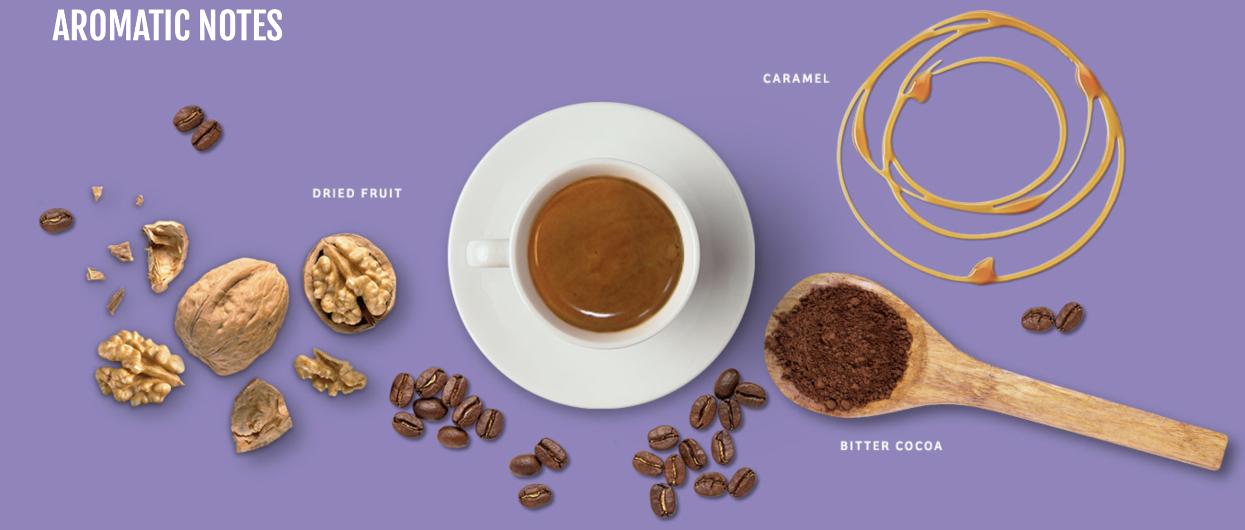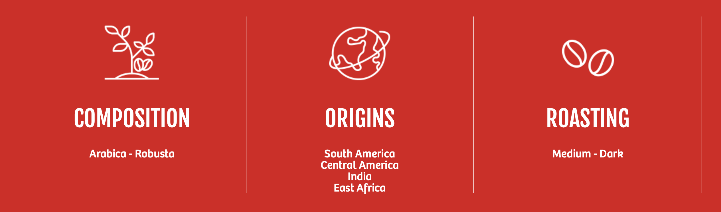 Un mélange d’Arabica et de Robusta dans lequel les doux parfums de fruits secs et de caramel provenant d’origines d’Amérique centrale et d’Amérique du Sud sont parfaitement équilibrés avec les parfums de cacao noisette et amer de Robusta. Caractère et intensité pour une tasse corsée et enveloppante.